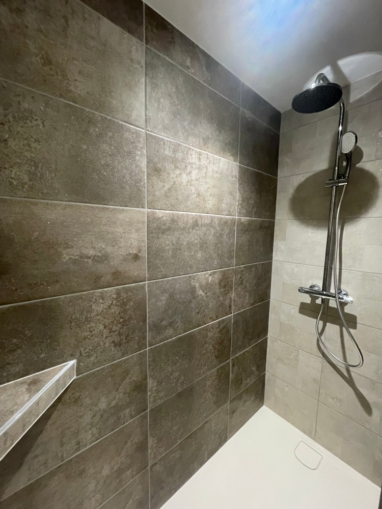 Une salle de bain avec douche italienne : sèche cheveux et produit de toilette. WC séparé et machine à laver le linge.